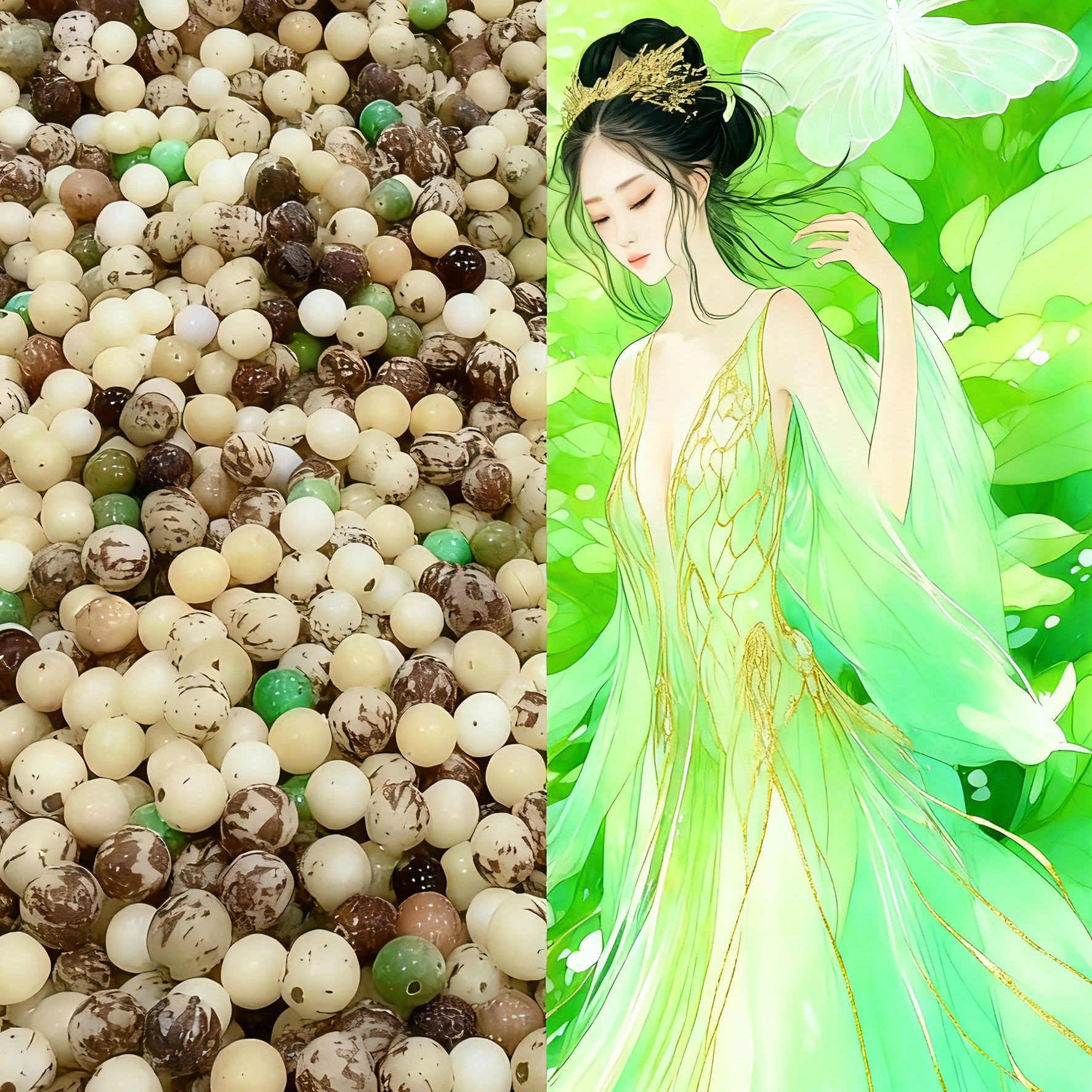 🎨ここの一捧の菩提ビーズは、初秋の月白とキャラメルを揉み込んだようで、暖かくもちもちしたミルクホワイトに淡い茶色の模様がまとわりつき、一つ一つに優しい潤いが宿っていて、手のひらに握るだけで心が落ち着くような柔らかさだ🎨
