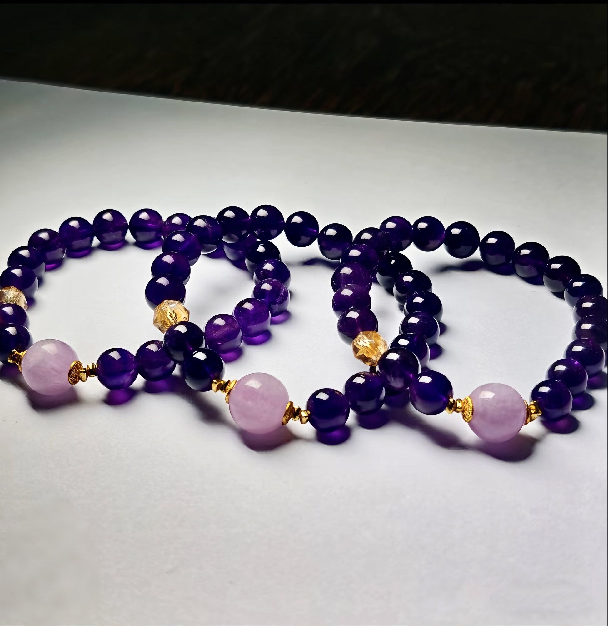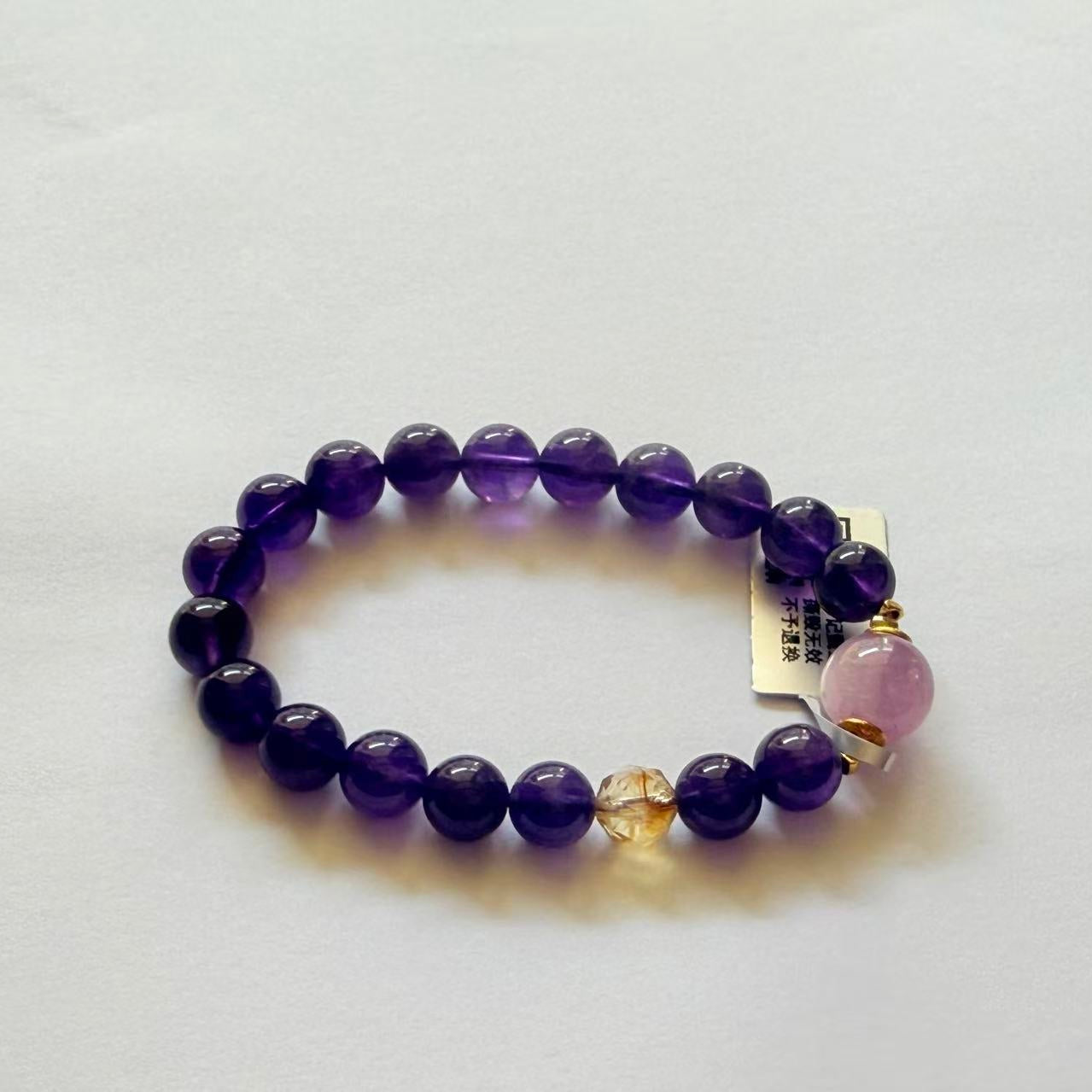 ✨濃紫のアメジストが静かな質感を放ち、クンツァイのトップビーズの柔らかいピンク調が冷たさを中和し、シトリンがまるで一筋の陽だまりのようにアクセントになっている✨手首をそっと揺らすと、光の下での輝きが超美しく、日常的にぼんやりしている時でも手首から優しい小さな幸せを感じられる~