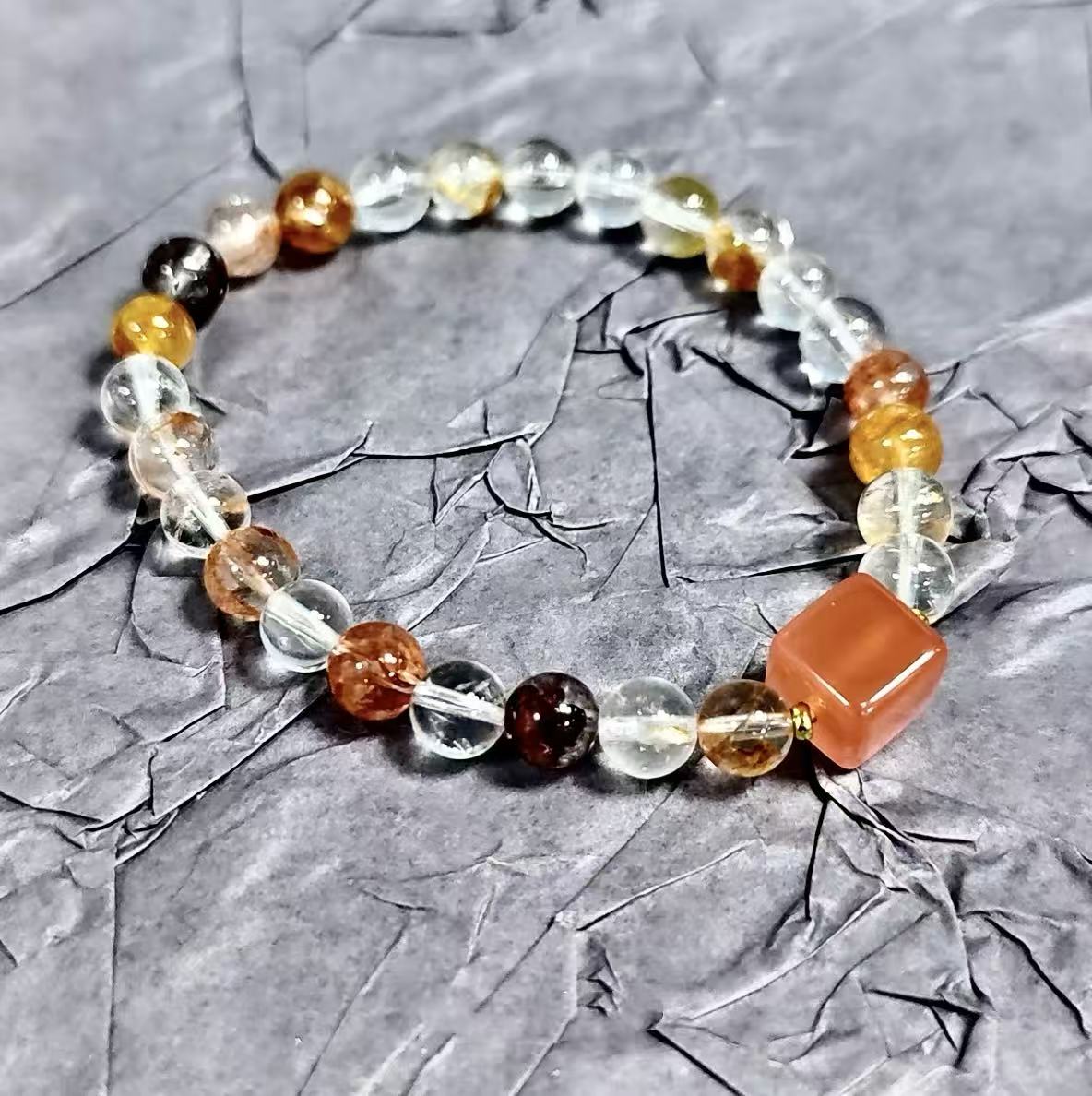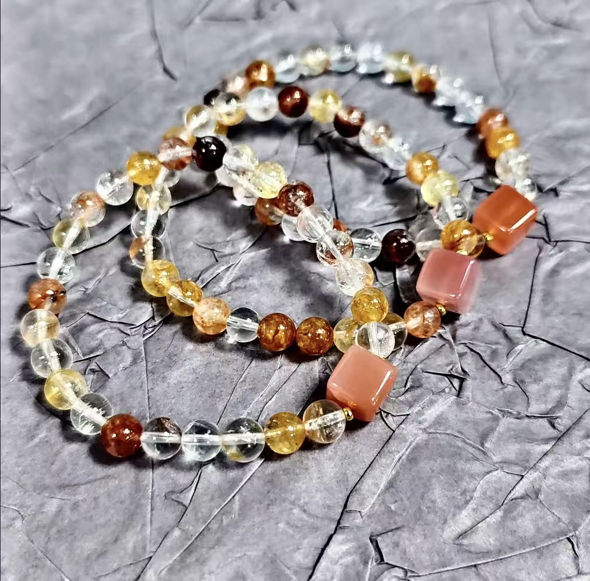 ファントムクオーツの透明感に細やかな暖光が包まれ、メノウスクエアカットの四角い輪郭が少しの利落さを添え、冷色系の背景が暖色系の茶色をより優しく引き立て、手首にすると不意に目を引く存在で、日常の中で握りしめられる、スウィートとクールがバランスした小さな幸せだ💫
