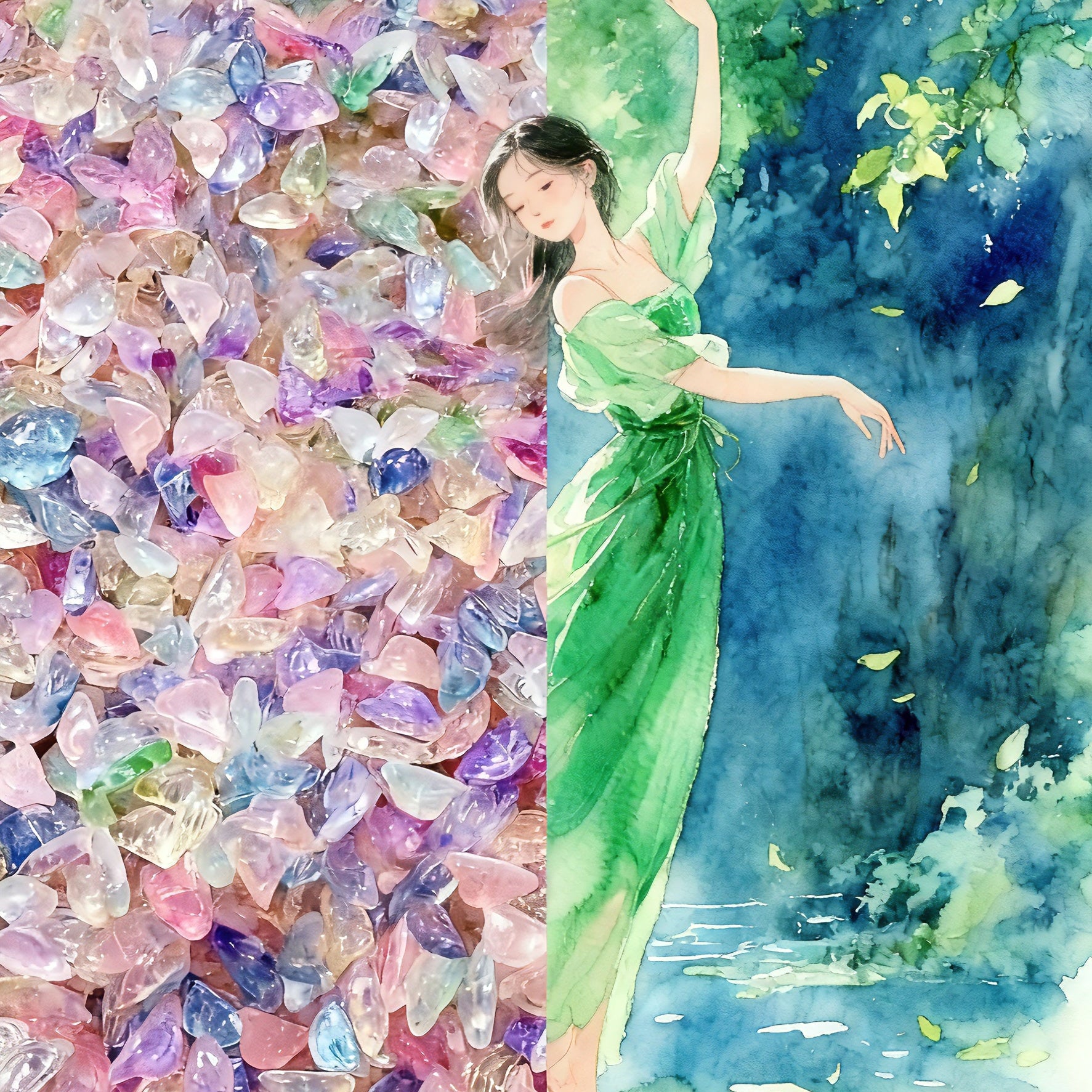 これらの瑠璃スズメは、まるで砕けた虹が全身に降りそそいだよう!ピンクと紫が水色に重なり、透き通った質感に細かな光が宿っていて、一つ一つが春の夢から羽ばたいて飛んできた小さな精霊みたいです✨
